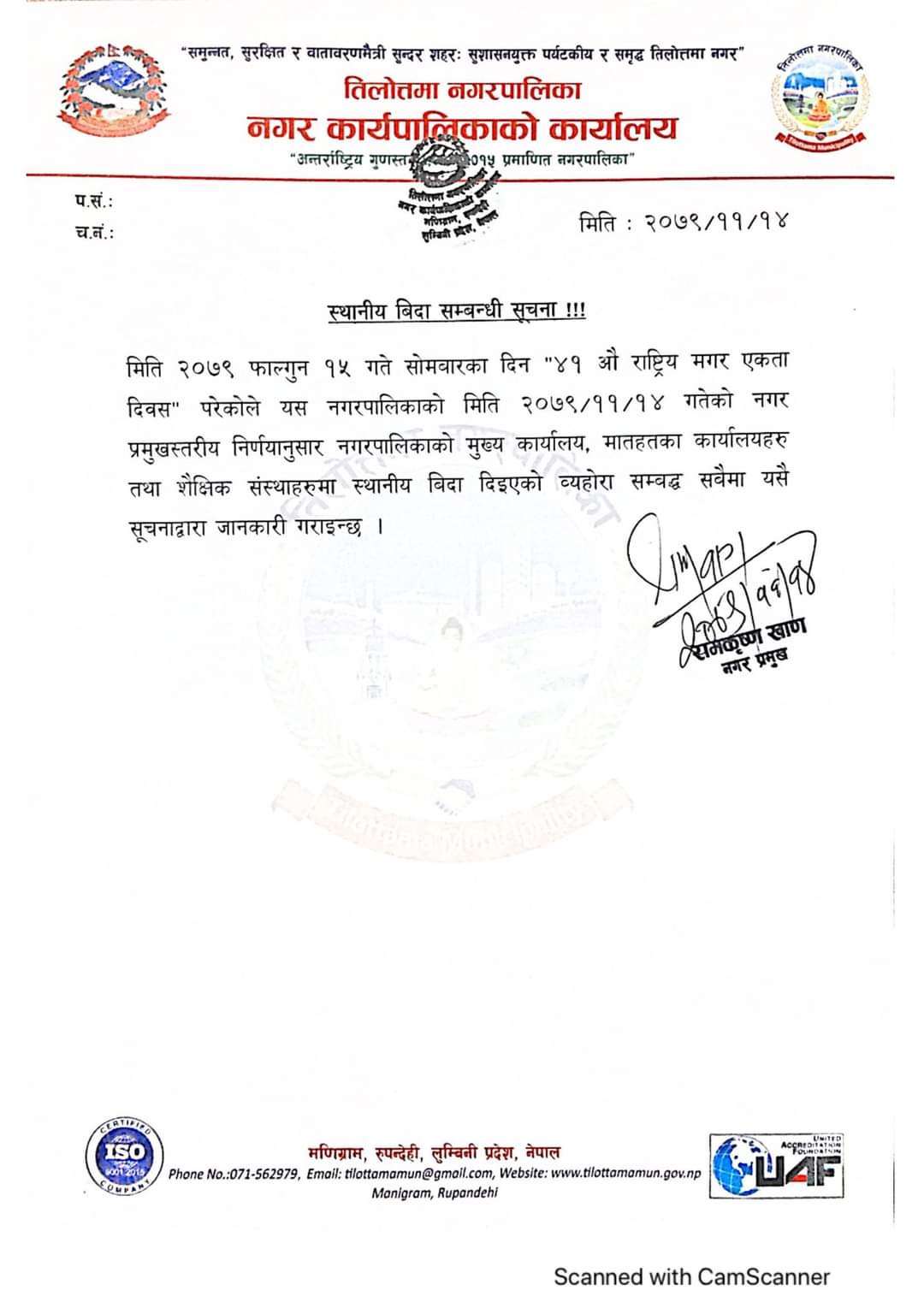 नगरप्रमुख खाणले एक बिज्ञप्ती जारी गर्दै नगरपालिकाको मुख्य कार्यालय मातहतका कार्यालयहरु तथा शैक्षिक संस्थाहरुमा स्थानीय विदा दिइएको जानकारी गराएका छन।